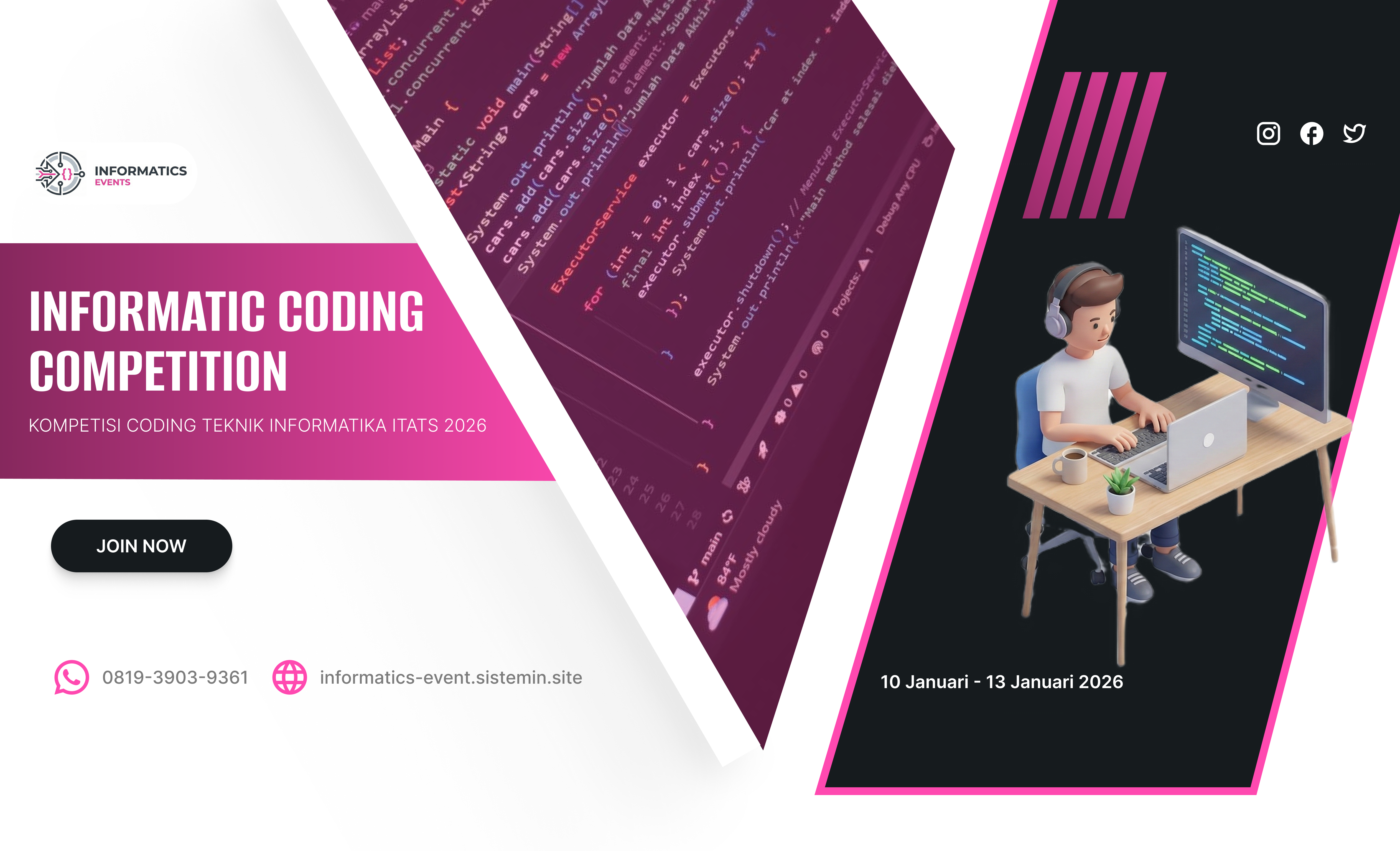 Dunia teknologi berkembang sangat cepat. Temukan workshop, seminar, dan kompetisi coding untuk memperdalam skill-mu dan membangun portofolio yang diminati industri masa kini.